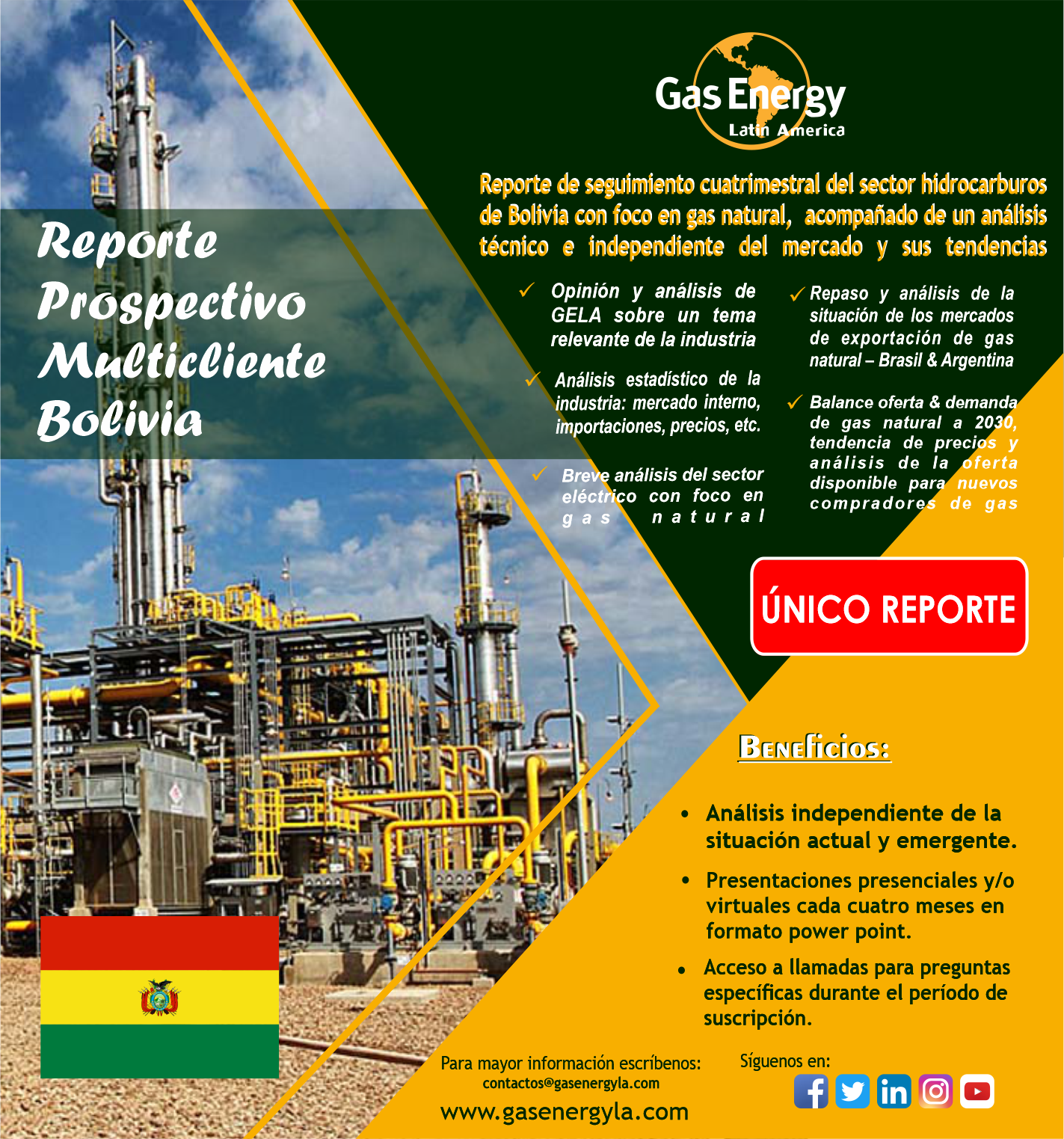 Nuestro servicio Multicliente Prospectivo sobre la Industria Energética en Bolivia es un informe que contempla un análisis profundo, especializado e imparcial de la cadena productiva del sector energético con foco en gas natural en Bolivia, no solo analiza la situación actual sino que presentan escenarios y una mirada profunda al futuro de la cadena de hidrocarburos y electricidad.